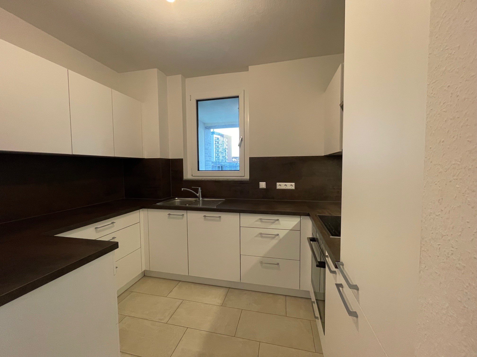 Der separate Kochbereich wurde mit einer modernen Einbauküche und hochwertigen Einbaugeräten ausgestattet, die bereits im Mietpreis enthalten sind. Im Wohn- und Schlafzimmer wurde Echtholzparkett aus dunkler Eiche verlegt und verleiht den Räumen einen warmen und eleganten Stil.