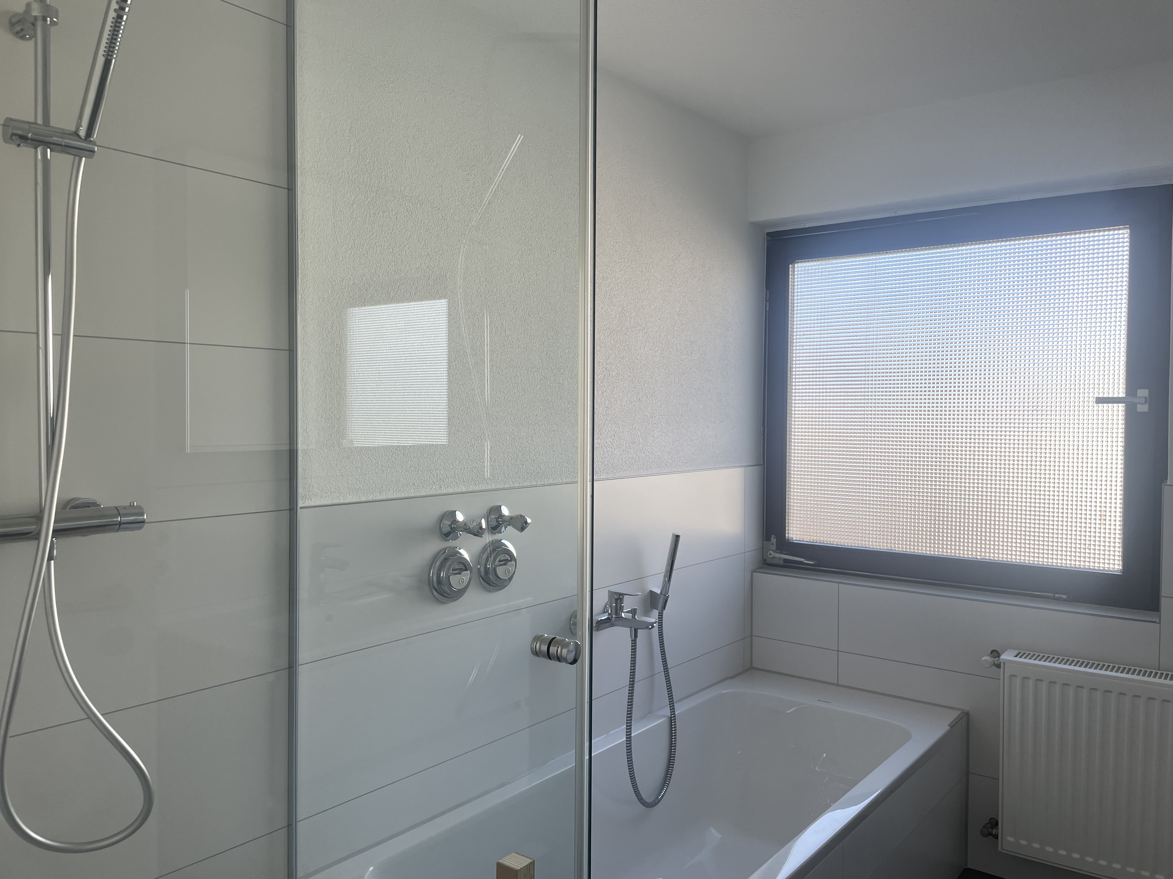 Das frisch renovierte Bad lässt keine Wünsche offen: Eine komfortable Badewanne lädt zum Entspannen ein, während die separate Dusche mit moderner Glasabtrennung für den schnellen Start in den Tag sorgt. Hochwertige Fliesen und stilvolle Armaturen geben dem Bad ein zeitlos elegantes Design.